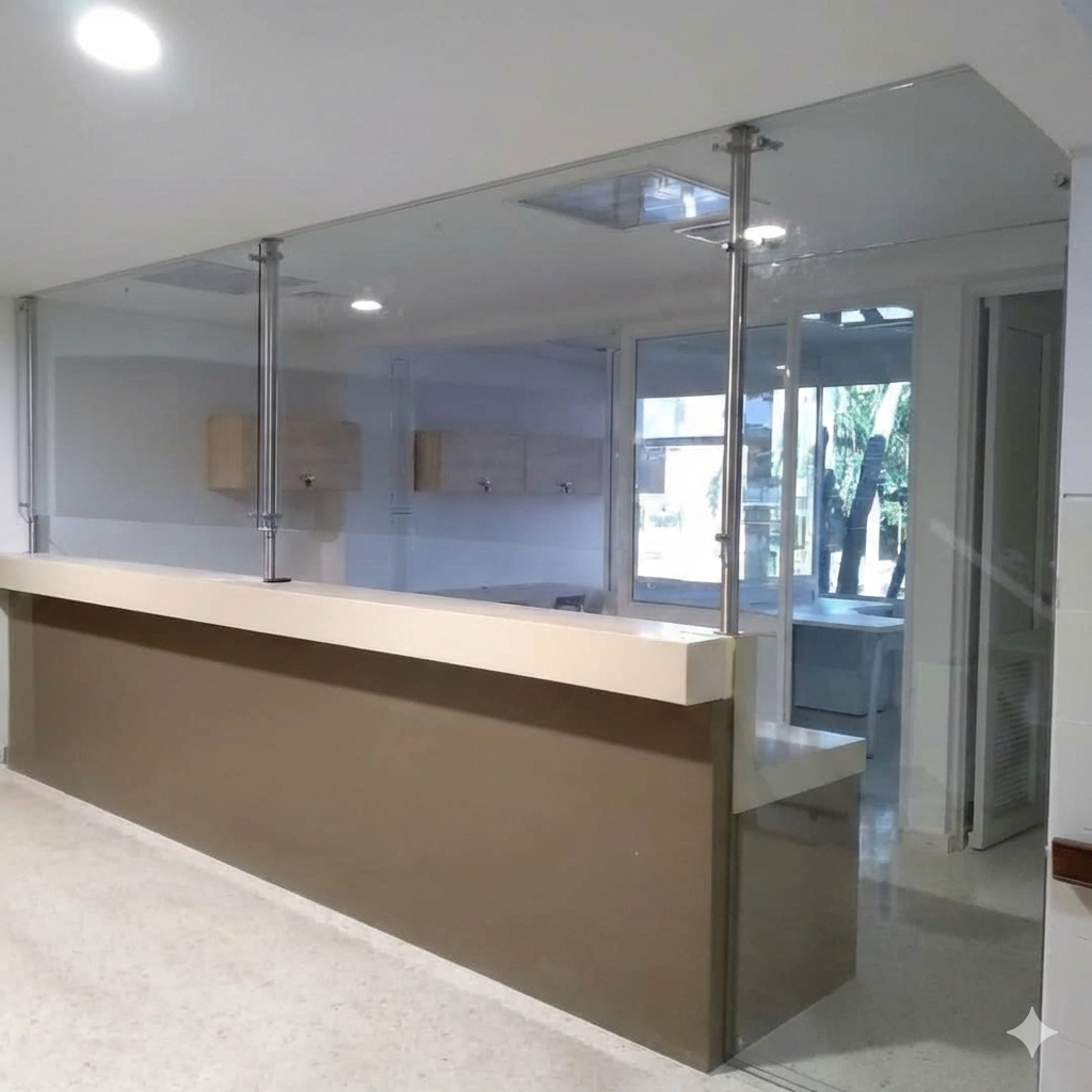 Soluciones modernas en vidrio templado para oficinas, recepciones y espacios interiores.